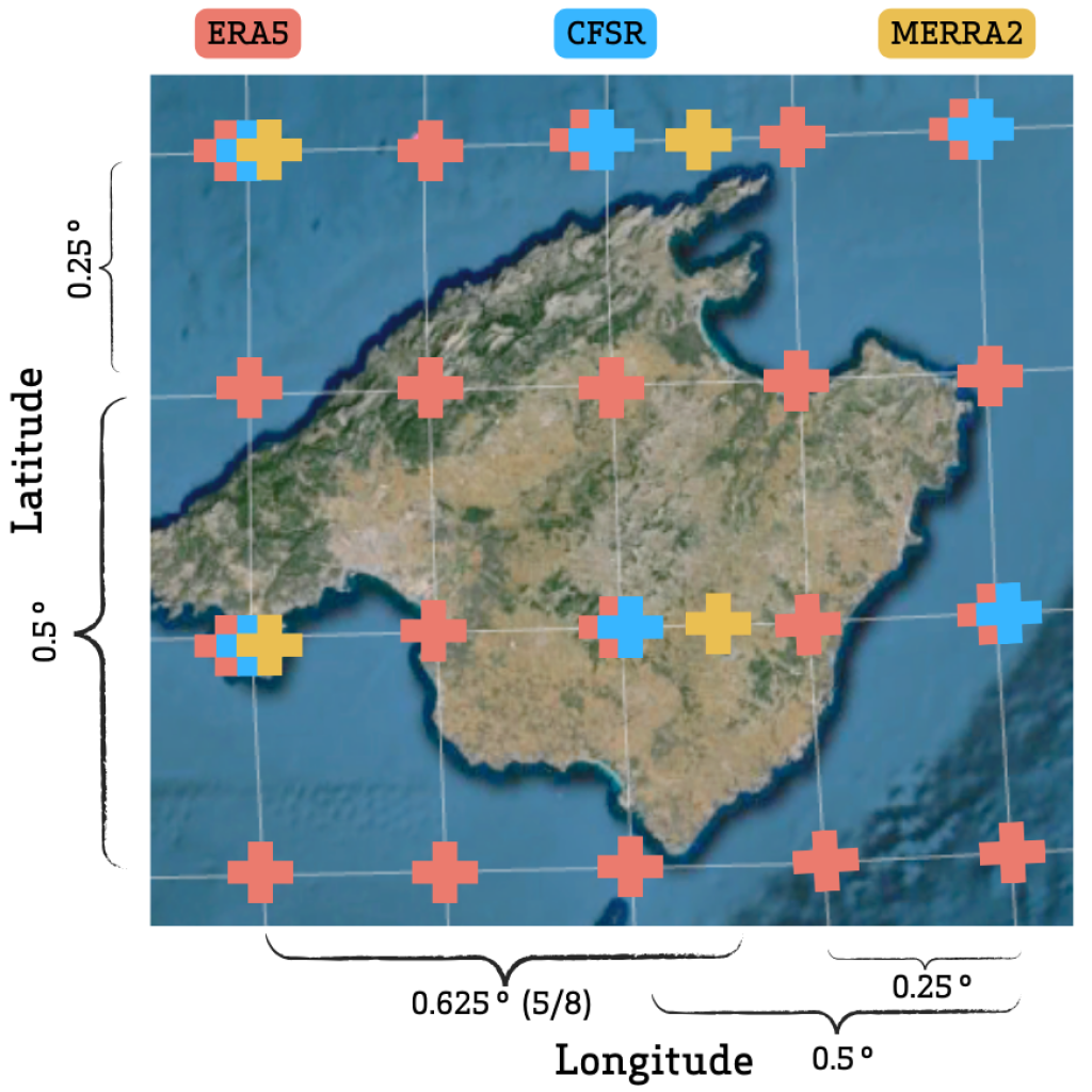 Grid nodes for each reanalysis dataset over the island of Mallorca, which is approximately 100km wide from West to East.
