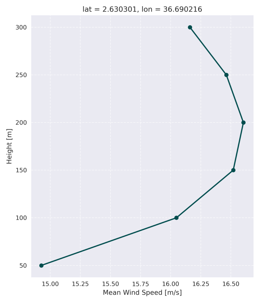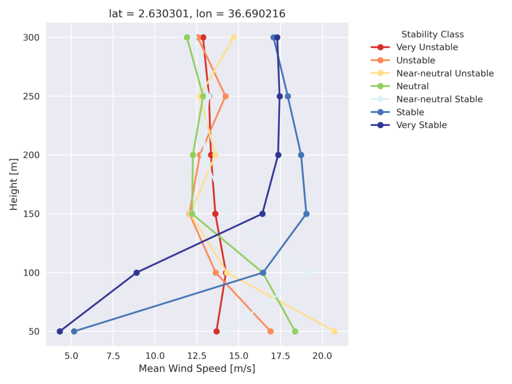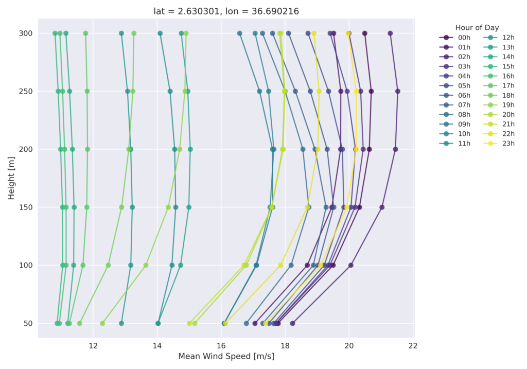 Figure 3: Mean Wind Speed Profile by Hour of Day—Shows diurnal wind speed variations (50–300 m) with a nocturnal peak of ~18–20 m/s.
