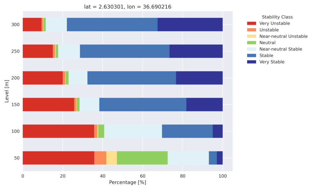 Figure 4: Stability Distribution—Displays stability classes (Very Unstable to Very Stable) across heights using the Richardson Number.